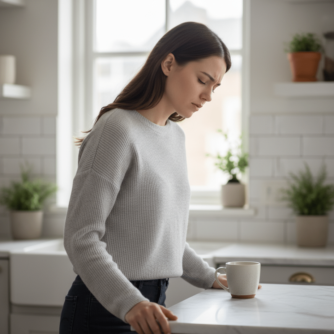 Eine Frau steht mit Symptomen eines Vitamin B Mangels in der Küche